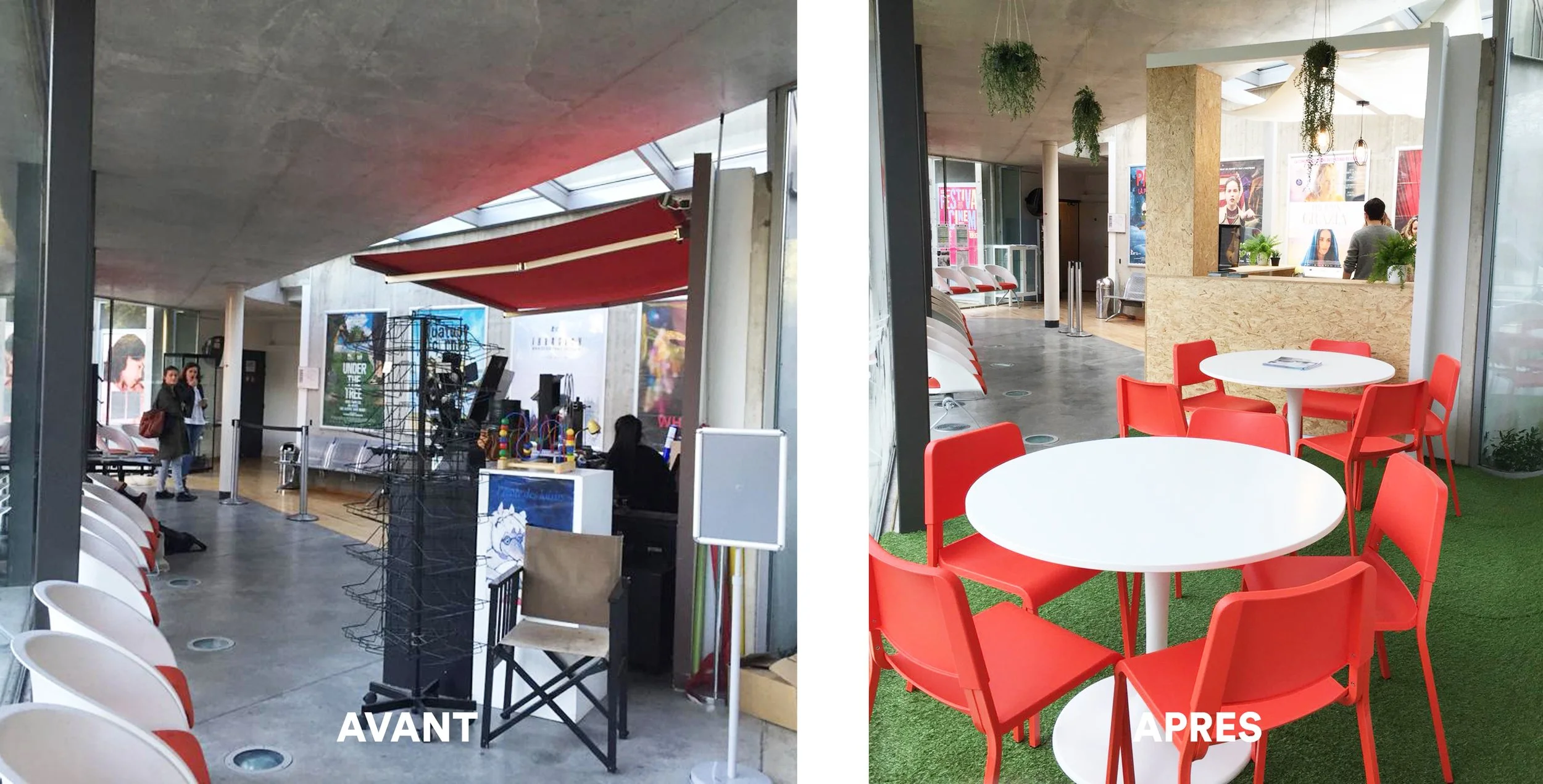 Le cinéma Jean Gabin d’Argenteuil est reconnaissable par son architecture en béton brut. Notre mission a été de créer une nouvelle banque d’accueil ainsi que d’aménager un coin pour des ateliers. Nous avons dû également choisir le mobilier de tout l’espace. Pour ce projet nous avons joué sur des couleurs attractives et joyeuses pour ‘réchauffer’ le côté brut du béton. L’apport du vert, du rouge et du bois, change considérablement l’aspect du lieu.